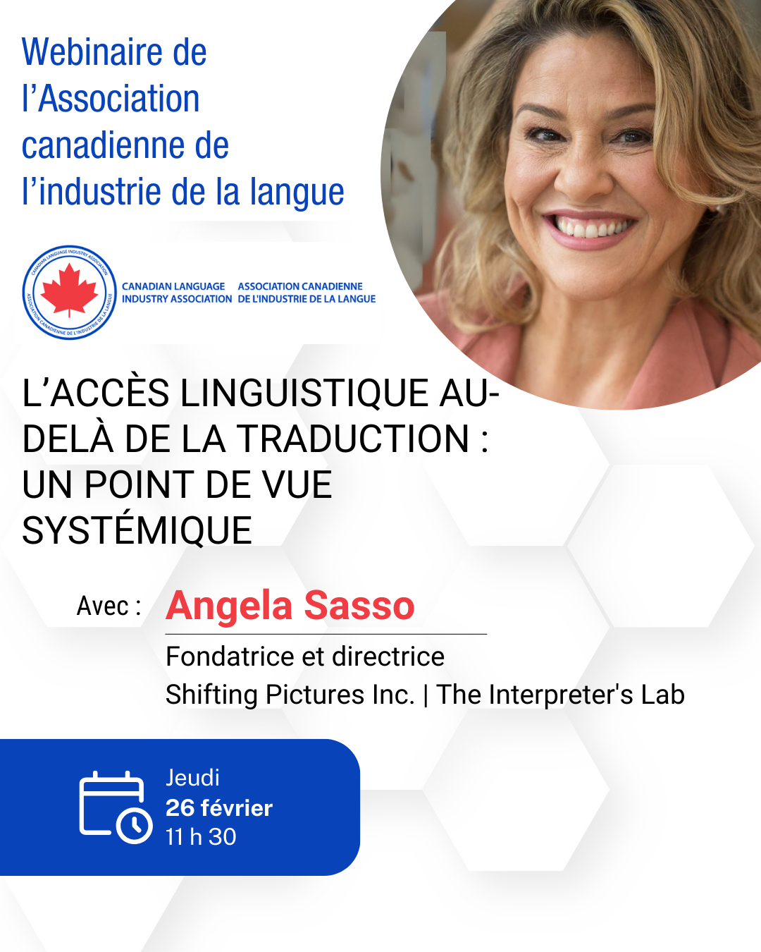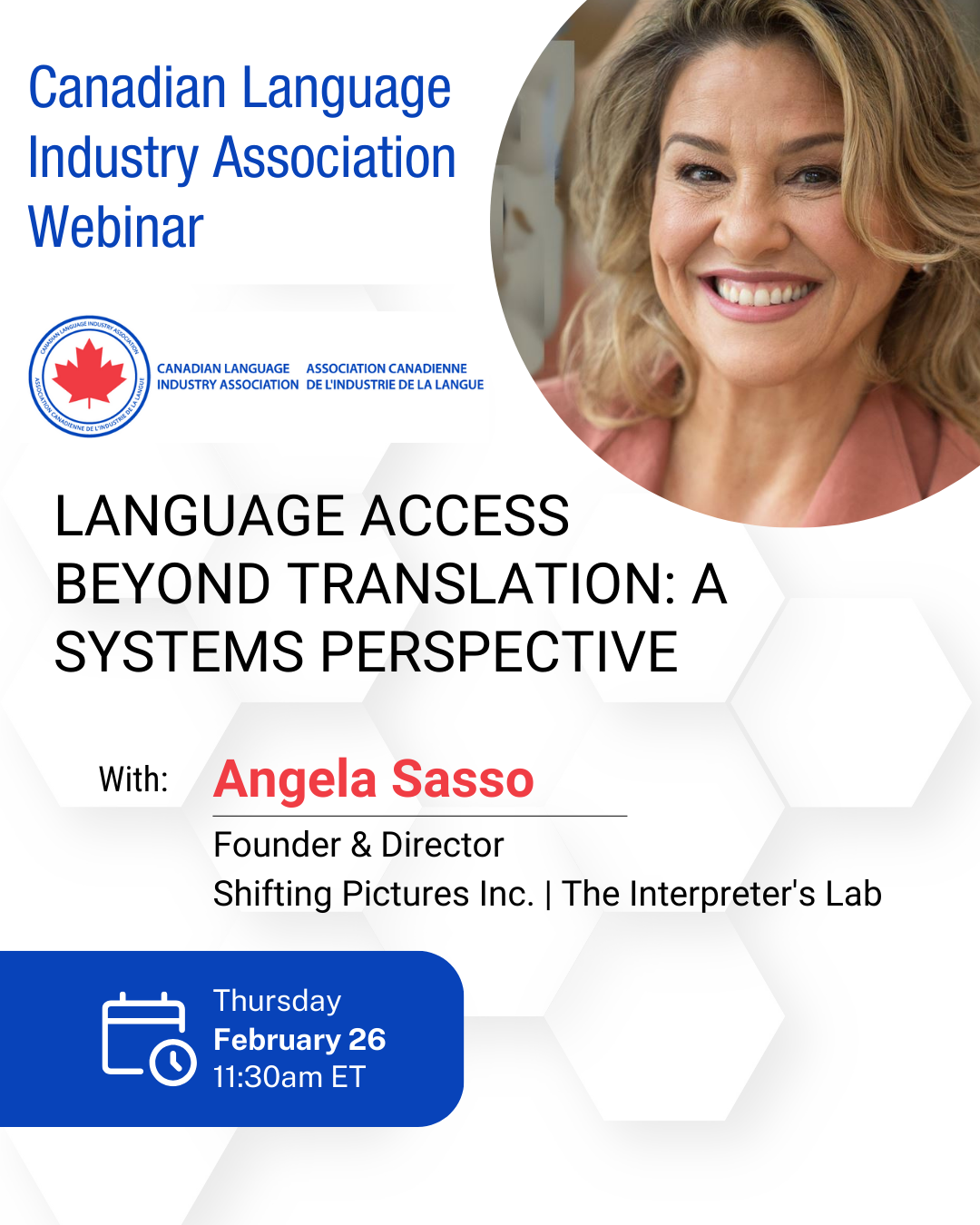 Angela Sasso is the Founder and Director of Shifting Pictures Inc. and The Interpreter’s Lab and has worked in language access and the Canadian language industry since 1990. Her work spans interpreter education, system design, and standards development, supporting organizations to move from ad hoc solutions to more coherent, sustainable approaches to language access across public and community service settings. Angela has contributed to national and international initiatives in interpreter training and certification, including ISO/TS 6253 - the global benchmark on training programs for interpreting in community settings, and brings a practical, systems-level perspective shaped by decades of collaboration with interpreters, language service providers, and public-sector organizations across Canada.